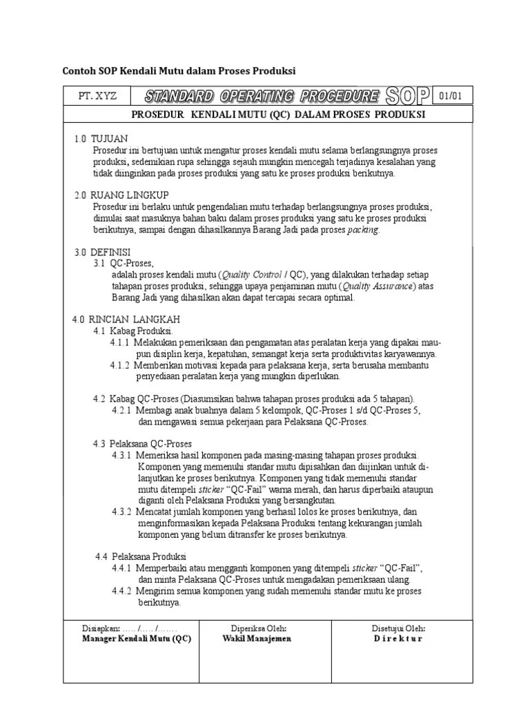 Procedure (sop) pada proses produksi. Dalam pembuatan sop dengan skala yang lebih besar dan kompleks, . Jangan melenceng dari tujuan, karena hal tersebut justru akan membuat kacau . Contoh sop perusahaan yang baik dan benar lengkap dengan pengertian, fungsi,. Ini dimaksudkan untuk menghindari kekecewaan pada proses produksi dan menjaga kualitas.